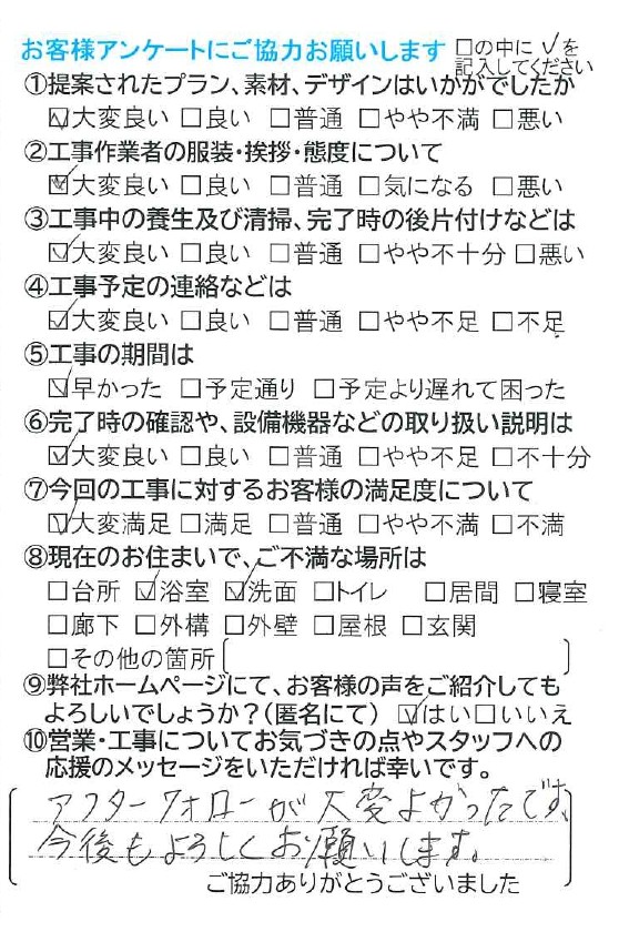 アフターフォローが大変良かったです。今後ともよろしくお願いします。