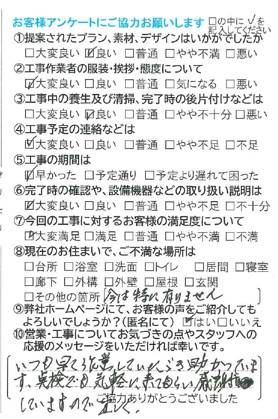 いつも早く作業していただき助かっています。点検でも気軽に来てもらい感謝していま…