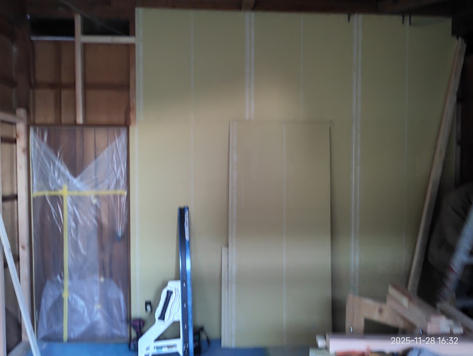 この下地材はクロス下地と耐力壁を兼ね備えた材料で、これまでの補強合板による施工だと、補強合板の上に更にクロス下地材を施工する必要があったため、大幅に省力することができます。しかも認定されている施工方法は、床勝ち、即ち、床はそのままで上の横架材までの施工となっていますので、床を壊さずに施工できる補強材です。