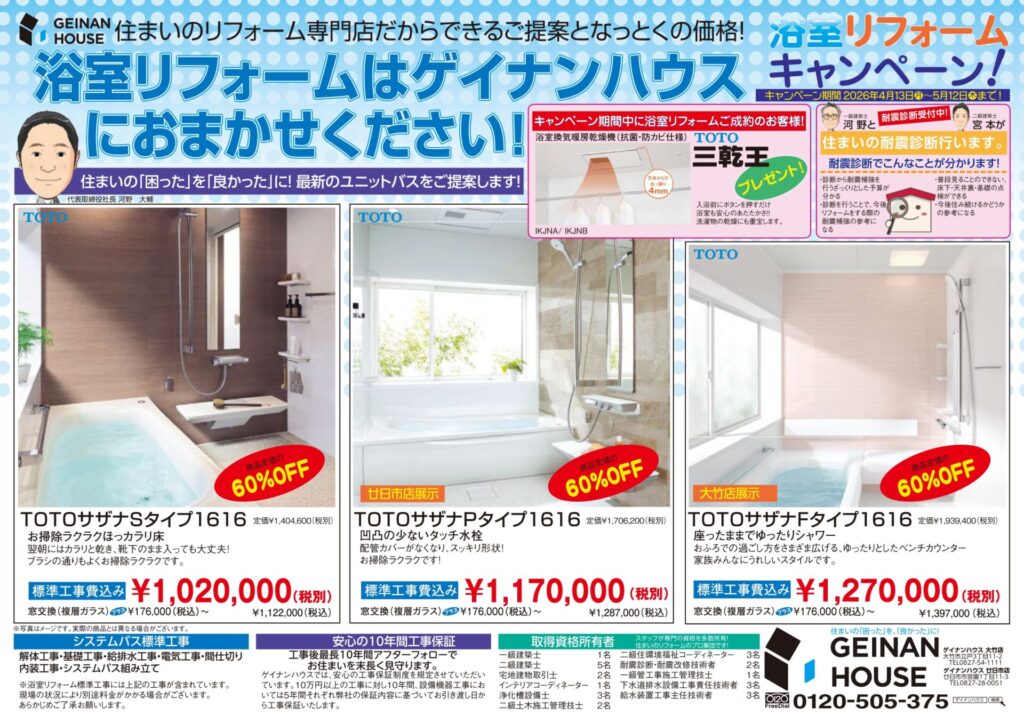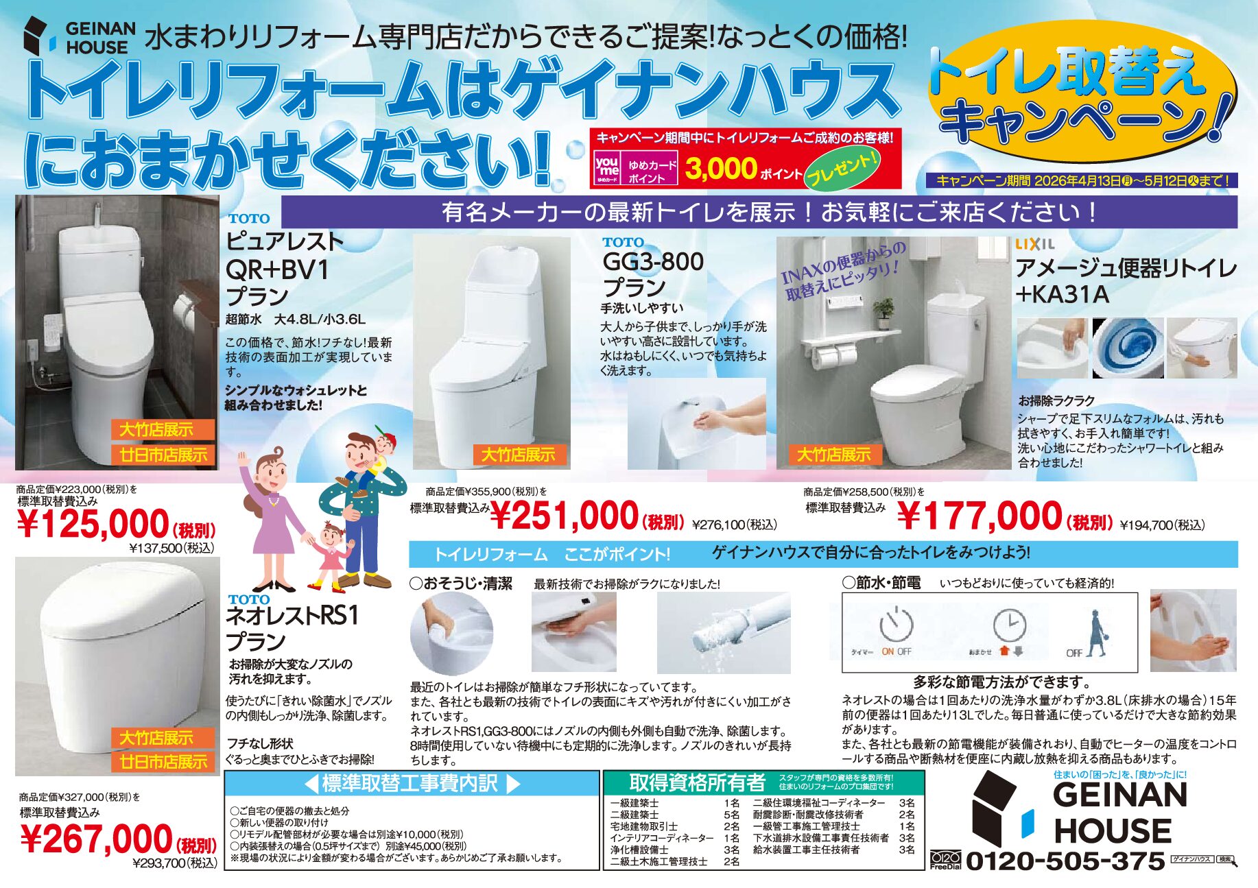 4/13(月)~5/12(火)まで、トイレと浴室のリフォームキャンペーンを行います!
