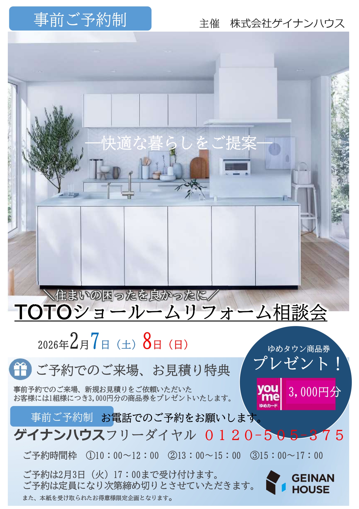 この期間中にトイレリフォームご成約のお客様には、ゆめタウンのポイント3,000ポイントをプレゼント!玄関ドアリモは50%オフ! ぜひこの機会にご検討下さい♪