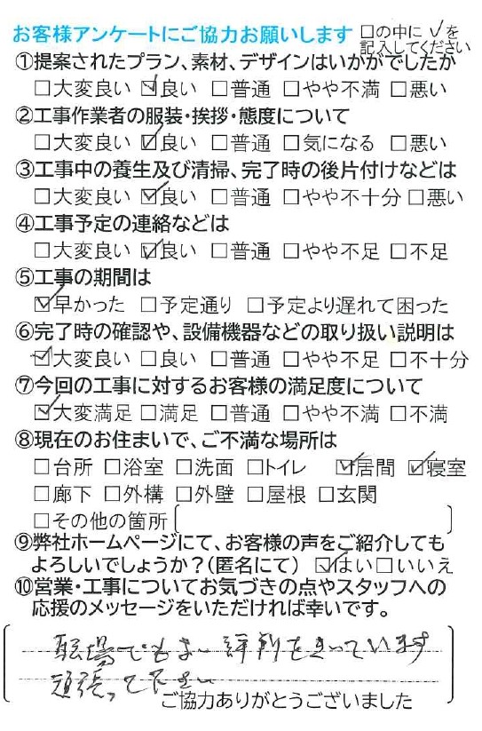 営業の方、工事の方々の対応は、非常に良かった。信頼出来る方々と思った。ありがとうござい…
